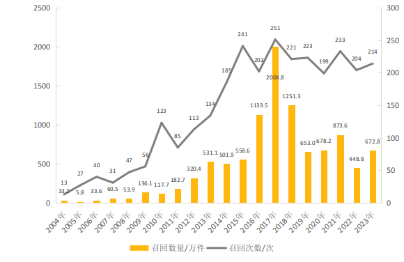 圖1 2004—2023年汽車產(chǎn)品召回的次數(shù)與數(shù)量