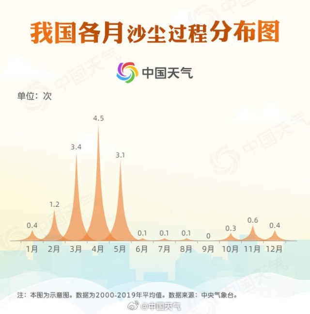 常年統(tǒng)計來看,我國沙塵天氣過程在一年中一般首次出現(xiàn)在2月,3-5月進(jìn)入高發(fā)期。從我國2000-2019年各月沙塵天氣過程的分布情況來看,3-5月的沙塵過程能占到全年的80%,4月份沙塵天氣最為頻繁,常年平均達(dá)到4.5次,3月和5月不相上下,分別為3.4次和3.1次。