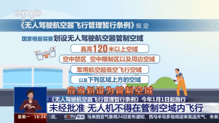北京航空航天大學航空專家 《航空知識》主編 王亞男:《無人駕駛航空器飛行管理暫行條例》對于無人機使用的空域作出了明確規(guī)定,真高120米以上空域、限制飛行的空域等,劃設為管制空域。無人機違規(guī)采集影像等數(shù)據(jù)可能危害國家安全,無人機“黑飛”或造成不可估量經(jīng)濟損失。