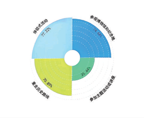 愛國主義教育入耳、入腦,更入心。此次調(diào)研中,79.75%的受訪者參與過紅色旅游,年齡主要集中在18~35歲之間。超過70%的人選擇參觀博物館和紀(jì)念地(74.68%)、重走歷史路線(70.89%)以及體驗(yàn)式活動(dòng)(77.22%)三種形式,90.87%的受訪者表示,參與紅色旅游的目的是學(xué)習(xí)歷史文化知識(shí)、接受紅色文化洗禮。