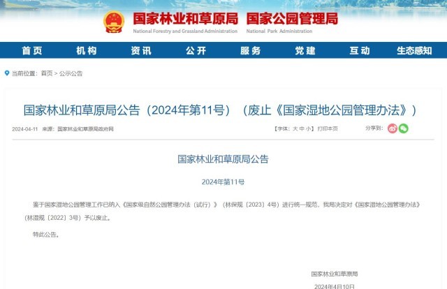 國家林草局:決定對《國家濕地公園管理辦法》予以廢止