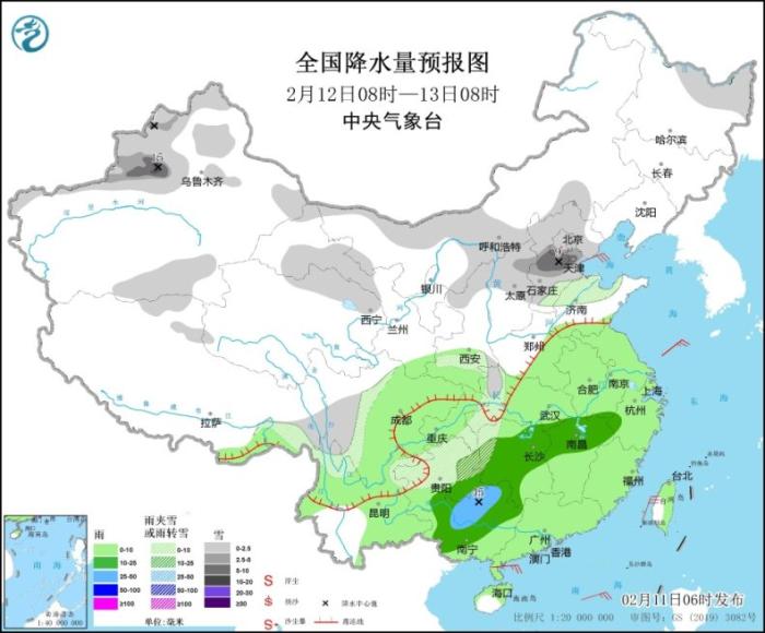 2月11日8時(shí)至12日8時(shí),內(nèi)蒙古中東部、東北地區(qū)北部、新疆沿天山地區(qū)和南疆盆地、西藏東部、青海北部和東部、甘肅中東部、寧夏南部、陜西西南部、川西高原等地部分地區(qū)有小到中雪,其中,黑龍江東南部、西藏東南部等地部分地區(qū)有大雪(5~8毫米)。江淮大部、江漢東部、江南、西南地區(qū)東部、華南大部、臺灣島大部等地部分地區(qū)有小到中雨。內(nèi)蒙古中部、西藏北部等地部分地區(qū)有4~6級風(fēng)。