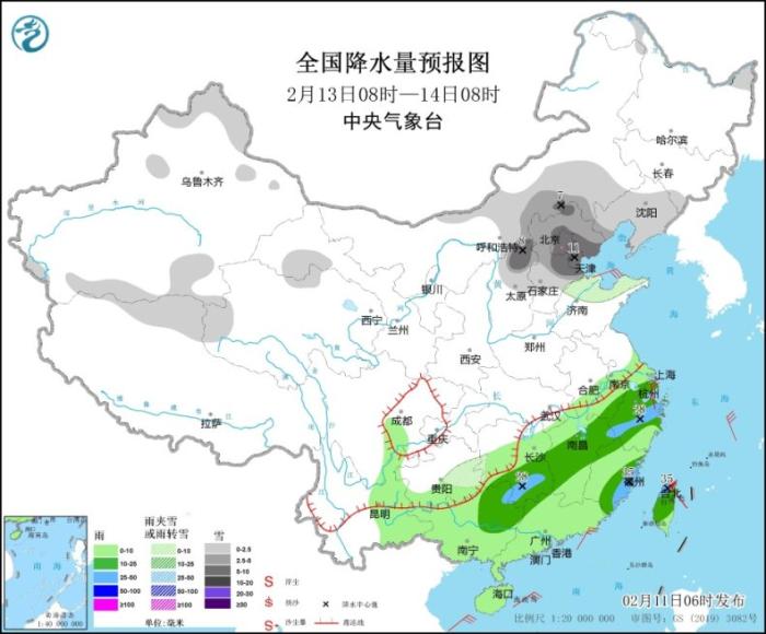 2月13日8時(shí)至14日8時(shí),新疆北部和南疆盆地、西藏北部、青海西部和北部、甘肅河西、內(nèi)蒙古中部、東北地區(qū)南部、華北大部等地部分地區(qū)有小到中雪,其中,山西北部、河北中北部、北京、天津等地部分地區(qū)有大到暴雪(10~11毫米)。江淮西部、江南大部、西南地區(qū)東南部、華南、臺灣島等地部分地區(qū)有小到中雨,其中,湖南南部、浙江中部、福建東南部、廣西東北部、臺灣島北部等地部分地區(qū)有大雨(25~35毫米)。