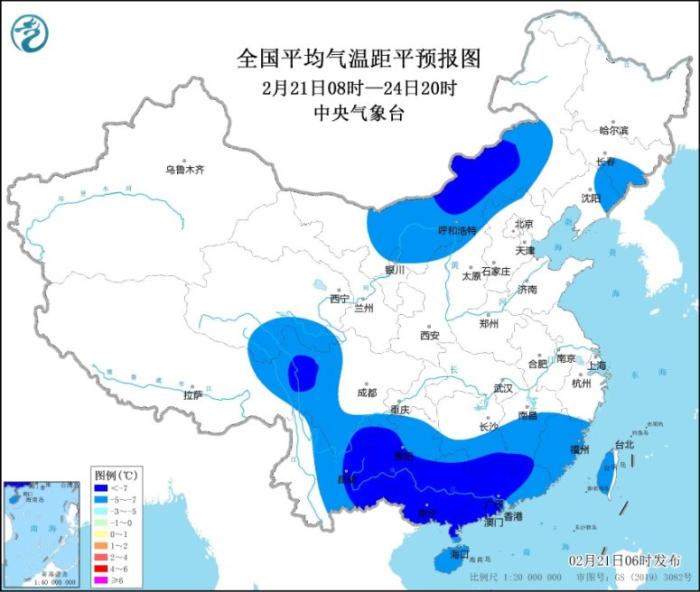 受持續(xù)陰雨雪和冷空氣共同影響,我國(guó)南方大部地區(qū)氣溫將顯著偏低。預(yù)計(jì)21日08時(shí)至24日20時(shí),貴州、四川西部和南部、湖南南部、江西中南部、云南東部、廣西、廣東、福建、海南和臺(tái)灣島等地的日平均氣溫較歷史同期偏低5℃以上,其中,云南東部、貴州南部、湖南南部、江西南部、廣西大部、廣東中西部等地偏低7℃以上,最低氣溫0℃線將壓至貴州南部、湖南南部、江西北部到浙江南部一帶,4℃線將壓至廣西中部到廣東中部一帶。另外,內(nèi)蒙古中部、吉林、青藏高原東部等地日平均氣溫也較歷史同期偏低5℃,部分地區(qū)偏低7℃。(見圖1、圖2)。