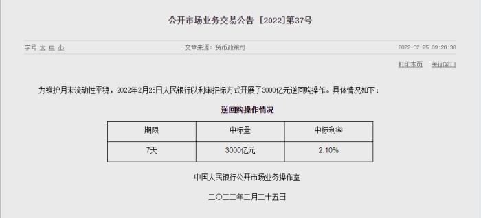 中新財(cái)經(jīng)2月25日電 中國人民銀行官網(wǎng)25日消息,為維護(hù)月末流動(dòng)性平穩(wěn),2022年2月25日人民銀行以利率招標(biāo)方式開展了3000億元逆回購操作。(完)