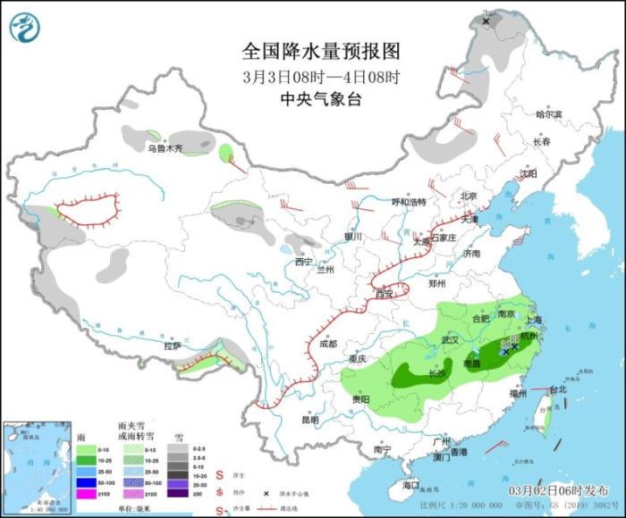 3月3日08時至4日08時,內(nèi)蒙古東北部、黑龍江西北部、新疆沿天山地區(qū)等地部分地區(qū)有小到中雪(2.5~3毫米)。江淮大部、江漢東部、江南大部、西南地區(qū)東南部、廣西東北部等地部分地區(qū)有小到中雨,其中,江西北部、浙江中部等地部分地區(qū)有大雨(25~35毫米)。內(nèi)蒙古、遼寧、新疆東部、陜西北部、山西中部、河北北部、山東半島等地部分地區(qū)有4~6級風(fēng),其中,內(nèi)蒙古西北部部分地區(qū)有6~7級風(fēng)。