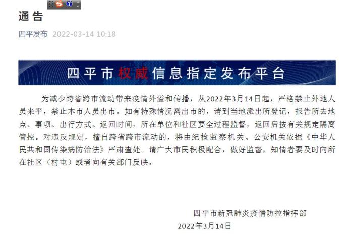 中新網(wǎng)3月14日電 據(jù)“四平發(fā)布”微信公眾號消息,14日,吉林省四平市新冠肺炎疫情防控指揮部發(fā)布通告,為減少跨省跨市流動帶來疫情外溢和傳播,從2022年3月14日起,嚴(yán)格禁止外地人員來平,禁止本市人員出市。如有特殊情況需出市的,請到當(dāng)?shù)嘏沙鏊怯?,報告所去地點、事項、出行方式、返回時間,所在單位和社區(qū)要全過程監(jiān)督,返回后按有關(guān)規(guī)定隔離管控。對違反規(guī)定,擅自跨省跨市流動的,將由紀(jì)檢監(jiān)察機關(guān)、公安機關(guān)依據(jù)《中華人民共和國傳染病防治法》嚴(yán)肅查處。請廣大市民積極配合,做好監(jiān)督,知情者要及時向所在社區(qū)(村屯)或者向有關(guān)部門反映。