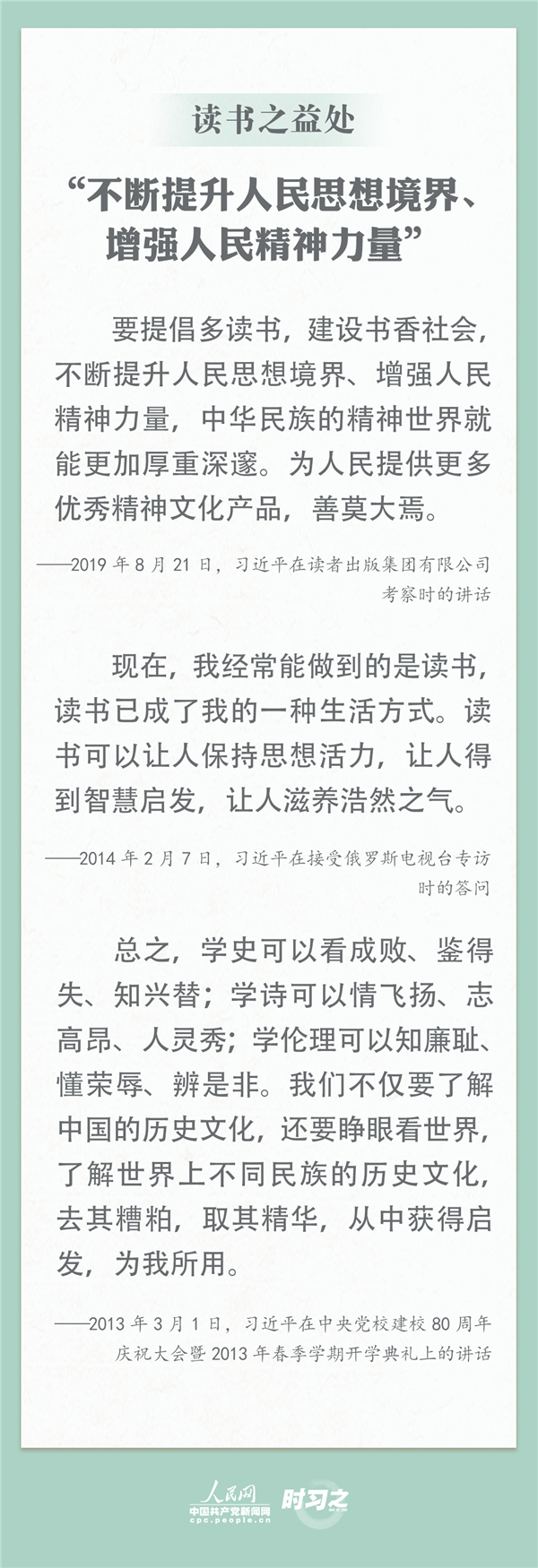 讀書滋養(yǎng)美好心靈。習近平總書記曾多次談及讀書的好處,“人民群眾多讀書,我們的民族精神就會厚重起來、深邃起來” 。4月23日是世界讀書日,跟習近平總書記學讀書之道,讓學習點亮生活,讓全民閱讀蔚然成風。