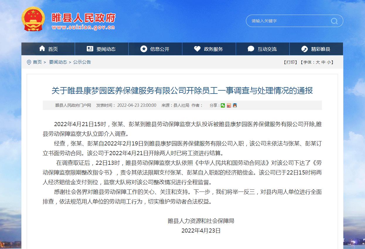 通報稱,4月21日15時,張某、彭某到睢縣勞動保障監(jiān)察大隊投訴被睢縣康夢園醫(yī)養(yǎng)保健服務有限公司開除,睢縣勞動保障監(jiān)察大隊立即介入調查。