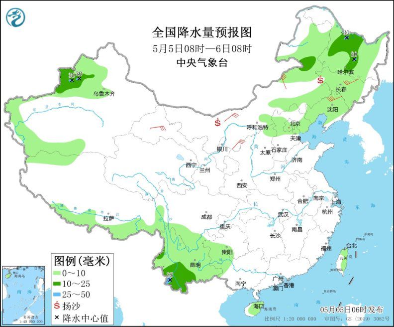 5月5日8時至6日8時,新疆西北部、內(nèi)蒙古東部、華北中北部、東北地區(qū)大部、西南地區(qū)南部等地的部分地區(qū)有小到中雨,局地有大雨。甘肅河西、內(nèi)蒙古、東北地區(qū)等地有5~7級風,部分地區(qū)并伴有浮塵或揚沙天氣。渤海、渤海海峽、黃海北部和中西部海域將有6~7級、陣風8級的偏南風轉東北風。