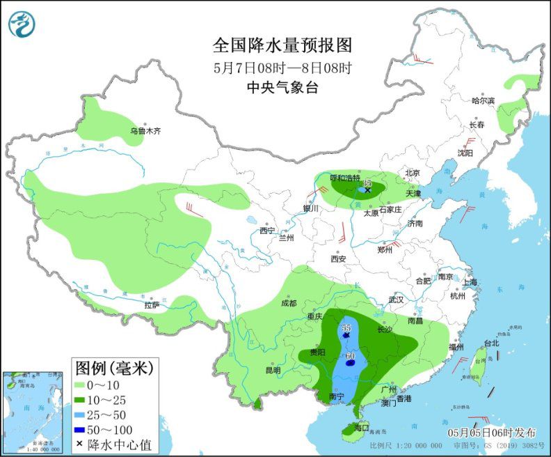 5月7日8時至8日8時,內(nèi)蒙古河套地區(qū)、陜西北部、山西北部、貴州東部和南部、江南西部、華南西部等地的部分地區(qū)有中到大雨,其中,湖南西部、廣西北部等地局地有暴雨(50~60毫米)。內(nèi)蒙古河套地區(qū)、東北地區(qū)南部、陜西北部等地部分地區(qū)有4~6級風。