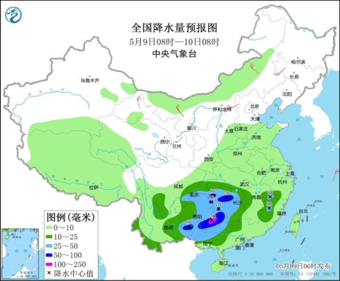 5月9日08時(shí)至10日08時(shí),西南地區(qū)東部和南部、江南西部、華南北部和西部等地部分地區(qū)有中到大雨,其中,湖南中西部、重慶東南部、貴州東南部、廣西北部等地部分地區(qū)有暴雨或大暴雨(100~140毫米)。甘肅河西、內(nèi)蒙古大部、東北地區(qū)等地部分地區(qū)有4~6級風(fēng)。