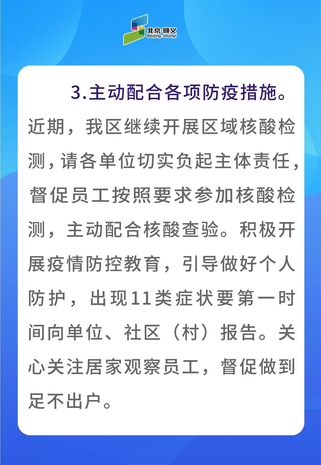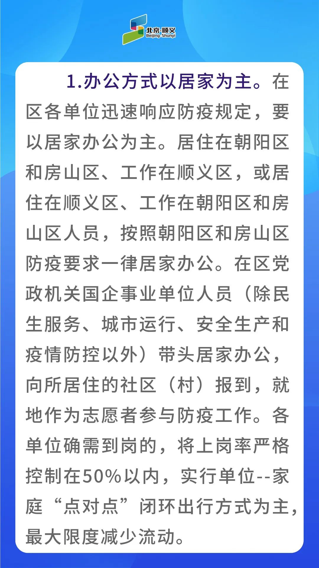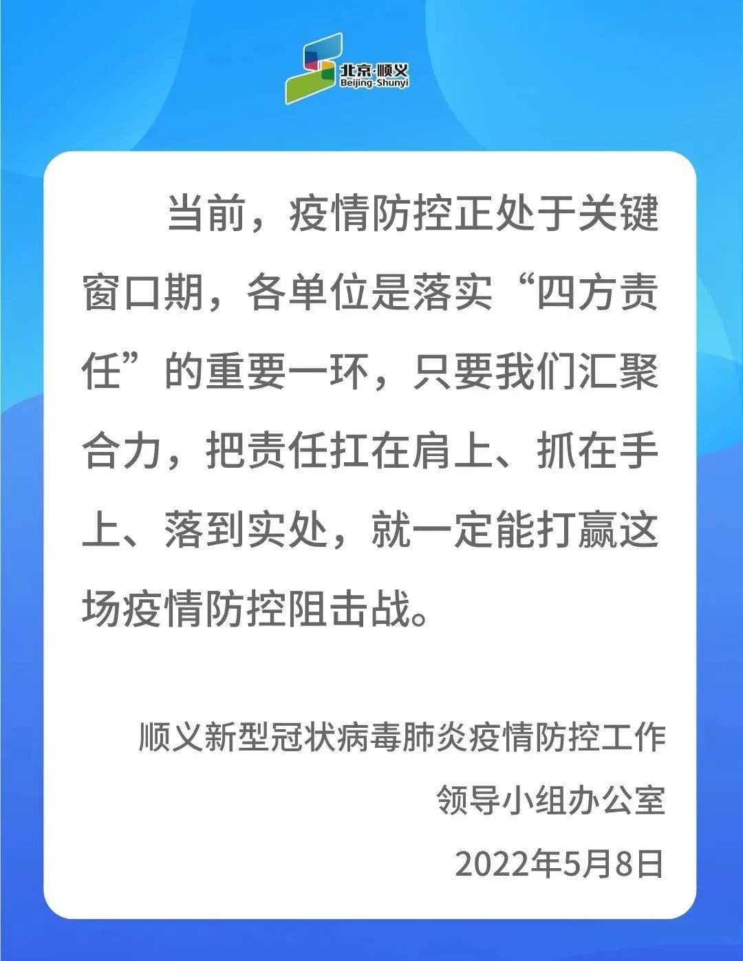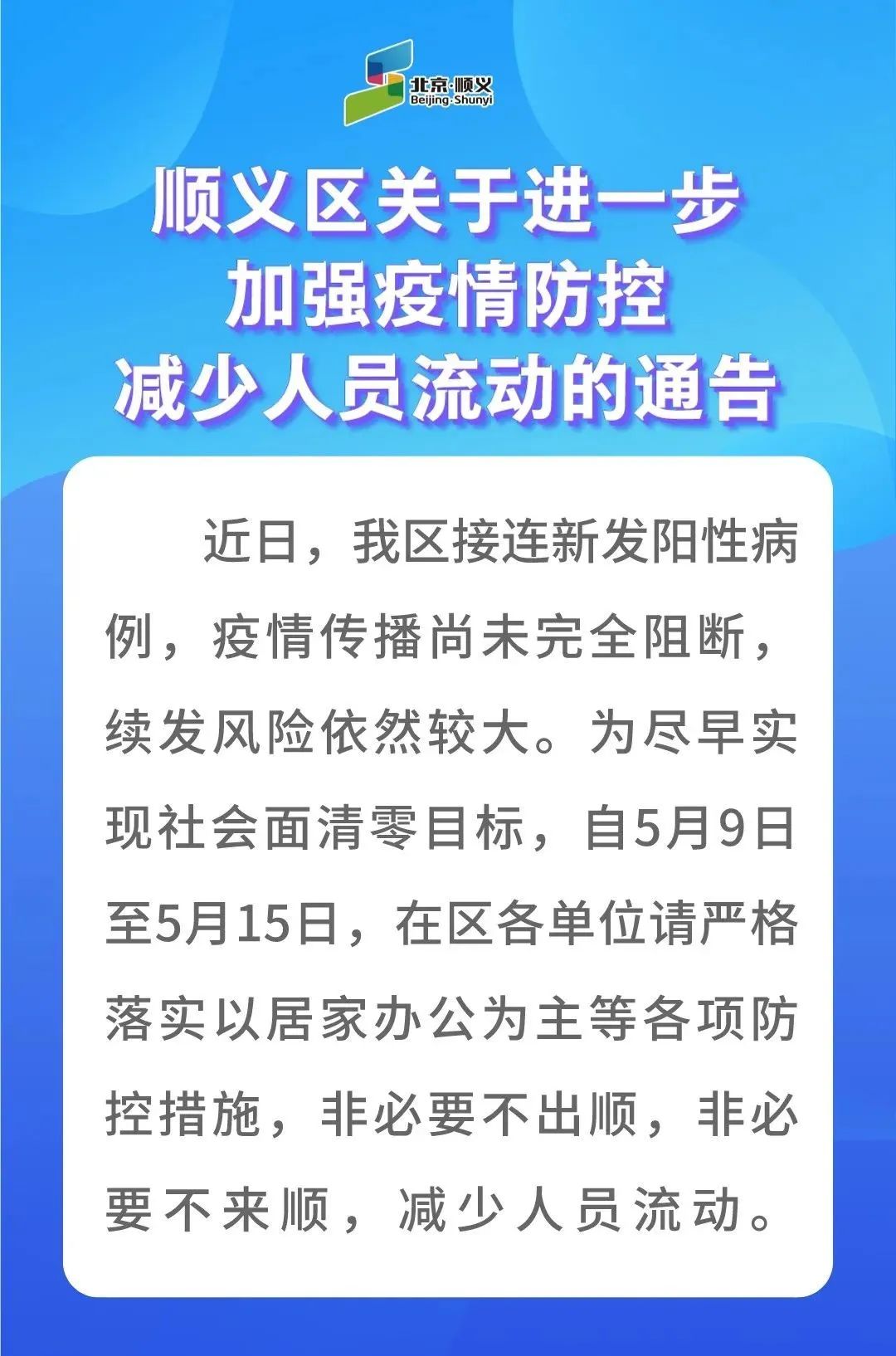 中新網(wǎng)5月8日電 據(jù)“北京順義”微信公眾號消息,5月8日,順義區(qū)發(fā)布《順義區(qū)關(guān)于進一步加強疫情防控減少人員流動的通告》指出,為盡早實現(xiàn)社會面清零目標(biāo),自5月9日至5月15日,在區(qū)各單位請嚴格落實以居家辦公為主等各項防控措施,非必要不出順,非必要不來順,減少人員流動。