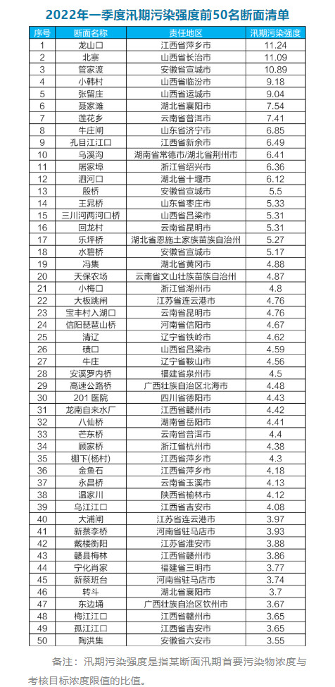 扣除自然因素影響,全國25個劣Ⅴ類斷面分布在12個省份。其中,云南省數(shù)量最多,為7個。22個水質(zhì)明顯惡化斷面分布在13個省份。其中,安徽省數(shù)量最多,為4個。全國汛期污染強度較大的前50個斷面分布在15個省份,江西、湖北、云南省數(shù)量較多,占比為42.0%。其中,江西省萍鄉(xiāng)市龍山口斷面、山西省長治市北寨斷面、安徽省宣城市管家渡斷面汛期污染強度位于全國前三名。