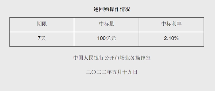 央行5月19日開展100億元逆回購操作 中標利率2.10%