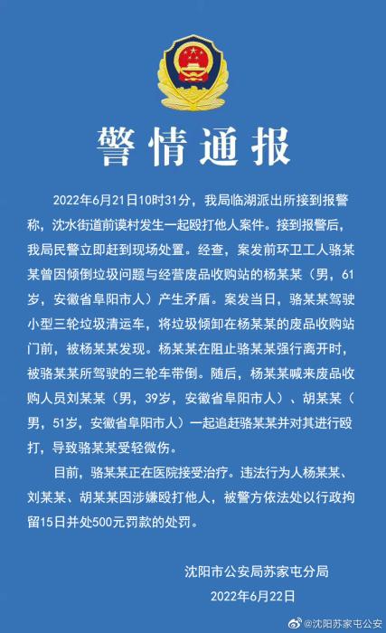 沈陽警方通報“多人毆打環(huán)衛(wèi)工”:三名打人者被行拘