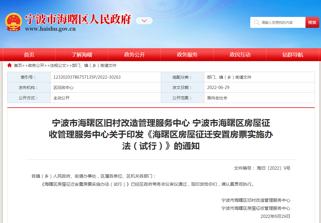 寧波海曙試行房票安置政策:可獲房屋價值補償部分6%的購房獎勵