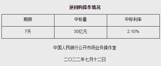 央行7月12日開展30億元逆回購(gòu)操作 中標(biāo)利率2.10%