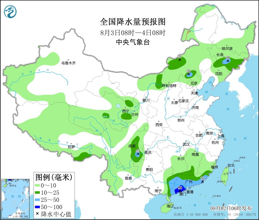 8月3日08時(shí)至4日08時(shí),內(nèi)蒙古中部、河北北部、吉林東部、遼寧北部、四川盆地西部和南部、廣西東部、廣東大部、福建東南部等地部分地區(qū)有中到大雨,其中,廣東西南部和東部沿海等地部分地區(qū)有暴雨(50~90毫米)。內(nèi)蒙古東北部部分地區(qū)有4~5級(jí)風(fēng)。