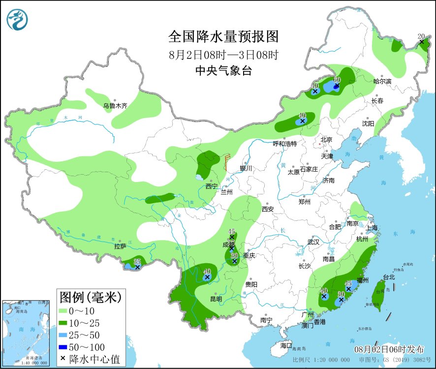 8月2日08時(shí)至3日08時(shí),青海北部和南部、內(nèi)蒙古中東部、黑龍江東北部、四川中部和南部、云南西部、江西東南部、浙江東南部、福建東部和南部、廣東東部、臺(tái)灣島等地部分地區(qū)有中到大雨,局地暴雨(50~60毫米)。內(nèi)蒙古西部部分地區(qū)有4~5級(jí)風(fēng)。