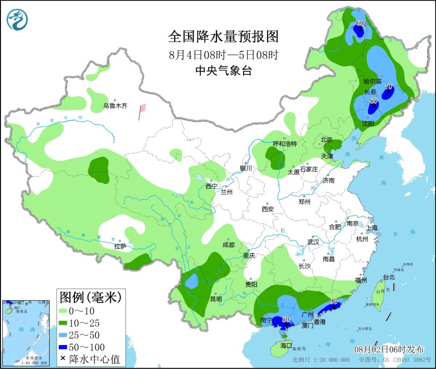 8月4日08時(shí)至5日08時(shí),內(nèi)蒙古東北部、東北地區(qū)大部、四川南部、云南中部和西北部、廣西大部、廣東大部等地有中到大雨,其中,內(nèi)蒙古東北部、黑龍江西北部和東南部、吉林中部、遼寧北部、廣西東南部沿海、廣東西南部和東部沿海等地部分地區(qū)有暴雨(50~90毫米)。黑龍江西北部部分地區(qū)有4~6級(jí)風(fēng)。