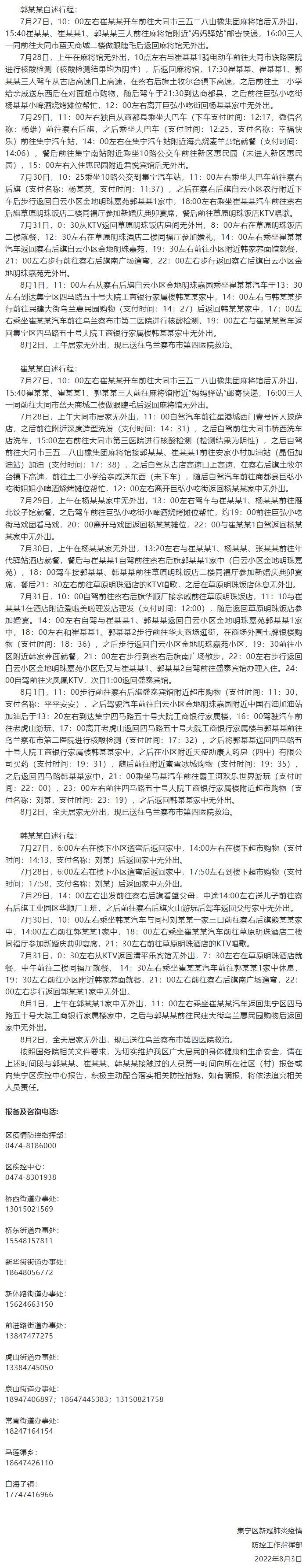 2022年8月2日,內(nèi)蒙古烏蘭察布市集寧區(qū)在居民“愿檢盡檢”中發(fā)現(xiàn)一管混檢異常樣本,隨即對(duì)所有混檢人員進(jìn)行單采單檢,其中大同市前來集寧區(qū)人員郭某某為初篩陽性,同時(shí)對(duì)郭某某同行同住人員進(jìn)行核酸檢測(cè),同行同住人員崔某某、韓某某為初篩陽性,目前此3例初篩陽性人員均已轉(zhuǎn)運(yùn)至定點(diǎn)救治醫(yī)院,現(xiàn)將3人的行程軌跡公布如下: