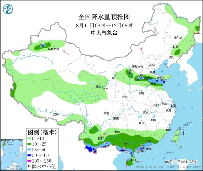8月11日08時(shí)至12日08時(shí),云南南部、廣西南部、廣東西南部沿海以及山西中部、河北南部、山東中部等地部分地區(qū)有大到暴雨,其中,云南南部局地有大暴雨(100~120毫米)。內(nèi)蒙古中東部、新疆東部、云南中南部、廣西南部、廣東西南部沿海、海南島西部等地部分地區(qū)有4~6級(jí)風(fēng),局地風(fēng)力可達(dá)6~7級(jí)。