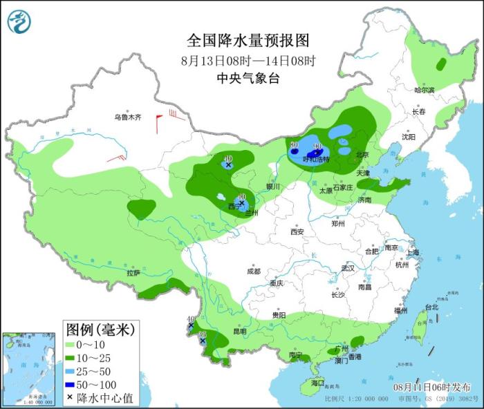 8月13日08時(shí)至14日08時(shí),內(nèi)蒙古中西部和東南部、西藏東南部、甘肅中部、青海東北部、華北中北部、山東北部、云南南部等地部分地區(qū)有中到大雨,其中,內(nèi)蒙古河套地區(qū)等地局地有暴雨(50~90毫米)。新疆東部和南疆盆地部分地區(qū)有4~6級(jí)風(fēng)。