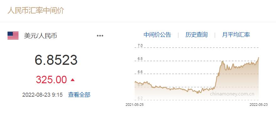 8月23日人民幣對美元中間價報6.8523 下調(diào)325個基點(diǎn)