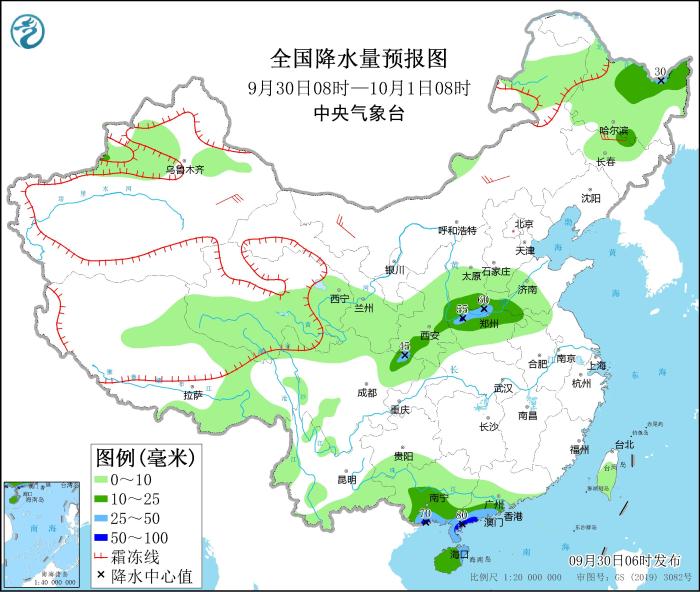 9月30日08時(shí)至10月1日08時(shí),廣西南部、廣東西南部、海南島、四川東北部、陜西南部、山西南部、河南北部等地的部分地區(qū)有中到大雨,局地暴雨(50~70毫米);黑龍江、吉林北部、新疆沿天山地區(qū)、青藏高原中東部等地的部分地區(qū)有小到中雨。新疆東部、內(nèi)蒙古中西部、東北地區(qū)東部等地的部分地區(qū)有4~6級風(fēng),新疆東部部分地區(qū)有7~8級風(fēng)。