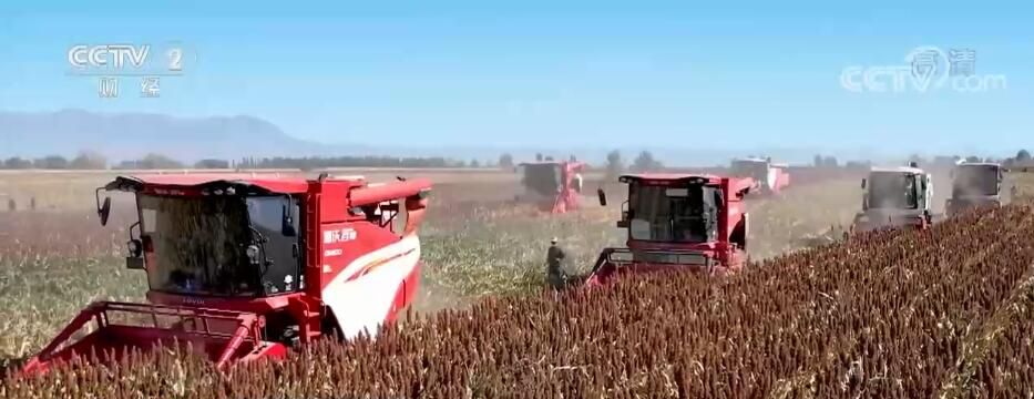 央視網(wǎng)消息:金秋時(shí)節(jié),甘肅省張掖市民樂(lè)縣的1.2萬(wàn)畝高粱已經(jīng)成熟了,紅色的高粱和穿梭的聯(lián)合收割機(jī)構(gòu)成一幅色彩艷麗的豐收畫卷。