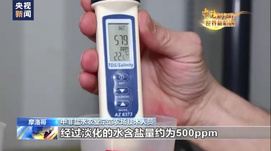 中非鹽水農(nóng)業(yè)示范農(nóng)場(chǎng)技術(shù)人員:經(jīng)過淡化的水含鹽量約為500ppm,而淡化之前,地下水的原本含鹽量可以看到是稍高于4000ppm。這真是太了不起了。