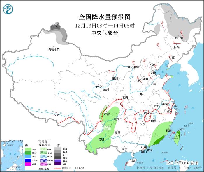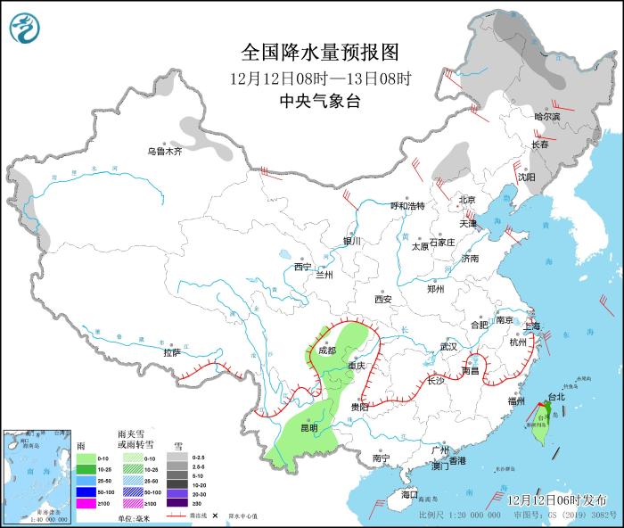 圖3 全國降水量預(yù)報圖(12月12日08時-13日08時)