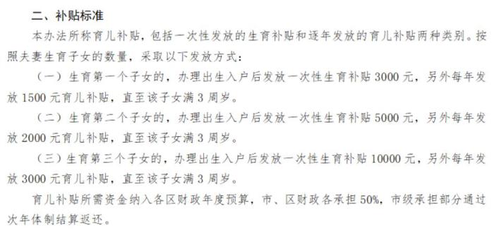 辦法擬規(guī)定,按照夫妻生育子女的數(shù)量,發(fā)放育兒補貼。其中,生育第一個子女的,辦理出生入戶后發(fā)放一次性生育補貼3000元,另外每年發(fā)放1500元育兒補貼,直至該子女滿3周歲;生育第二個子女的,辦理出生入戶后發(fā)放一次性生育補貼5000元,另外每年發(fā)放2000元育兒補貼,直至該子女滿3周歲;生育第三個子女的,辦理出生入戶后發(fā)放一次性生育補貼10000元,另外每年發(fā)放3000元育兒補貼,直至該子女滿3周歲。育兒補貼所需資金納入各區(qū)財政年度預(yù)算,市、區(qū)財政各承擔(dān)50%,市級承擔(dān)部分通過次年體制結(jié)算返還。(中新財經(jīng))