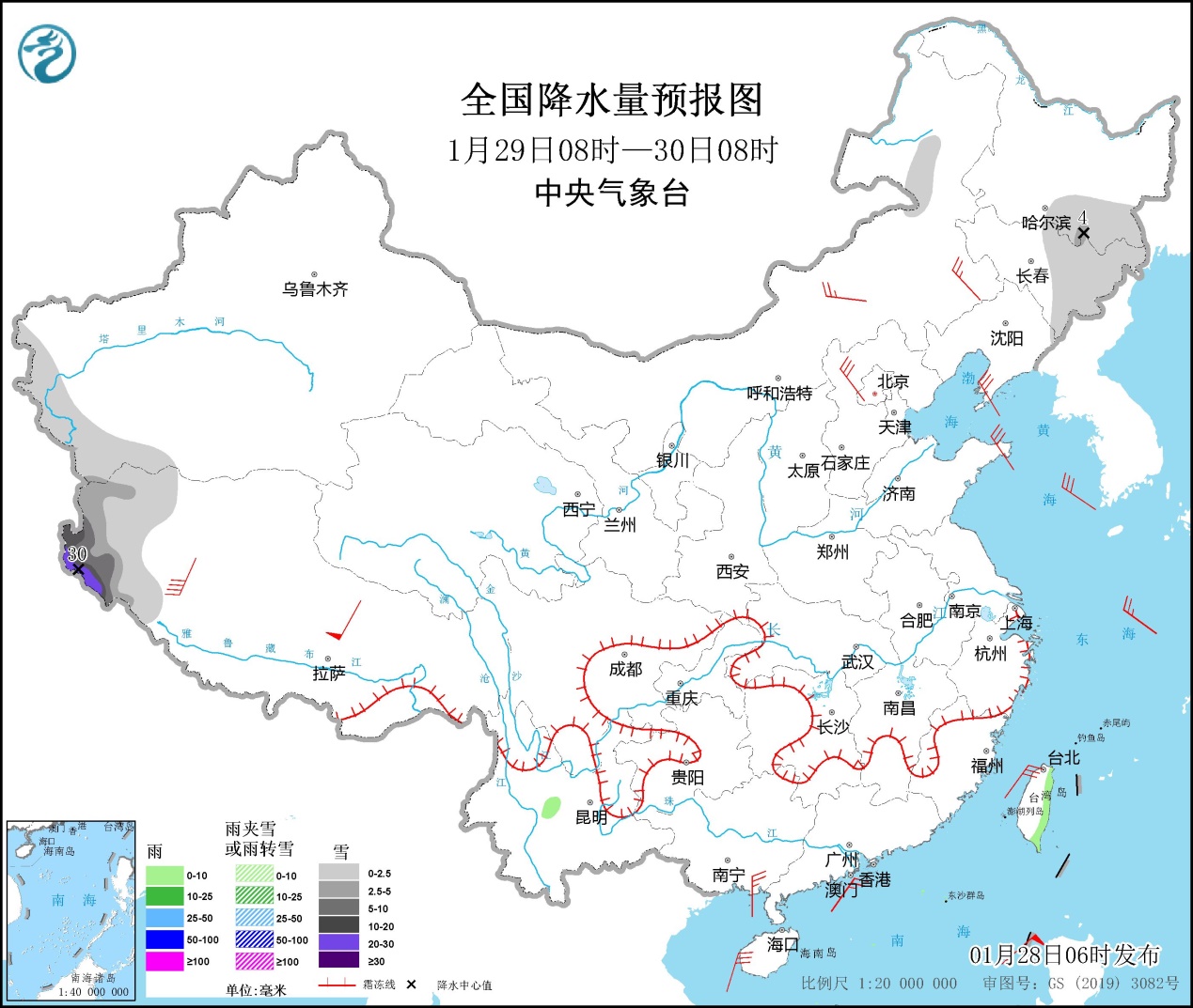 1月28日08時至29日08時,新疆西南部山區(qū)、內(nèi)蒙古東北部、黑龍江南部、吉林北部和東部、云南西北部、西藏東部等地的部分地區(qū)有小雪或雨夾雪,其中新疆西南部山區(qū)局地中雪或大雪(5~8毫米);西藏東南部、云南中部、臺灣島東部等地的部分地區(qū)有小雨。內(nèi)蒙古大部、華北北部、黑龍江東部、遼寧、山東半島、浙江、廣西東南部等地的部分地區(qū)有4~6級風,西藏中西部的部分地區(qū)風力可達7級以上(見圖1)。渤海、渤海海峽、黃海大部海域、東海大部海域、臺灣海峽、南海大部海域、北部灣有6~8級、陣風8~10級的大風,其中臺灣海峽、南海中東部和西南部的部分海域風力可達9級、陣風10~11級。