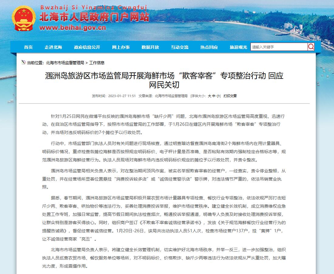中新網(wǎng)1月28日電 據(jù)北海市市場監(jiān)督管理局網(wǎng)站27日消息,針對1月25日網(wǎng)民在微博平臺反映的潿洲島海鮮市場“缺斤少兩”問題,北海市潿洲島旅游區(qū)市場監(jiān)管局高度重視,迅速行動,在自治區(qū)市場監(jiān)管局指導(dǎo)下,按照市市場監(jiān)管局的工作部署,于1月26日在轄區(qū)內(nèi)開展海鮮市場“欺客宰客”專項整治行動,并當(dāng)場對違反明碼標(biāo)價的7個攤位予以行政處罰。