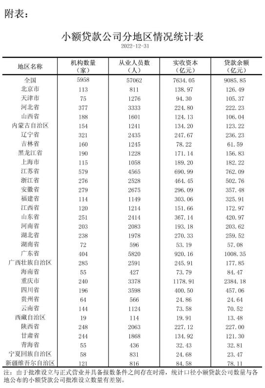 央行:截至2022年12月末全國共有小額貸款公司5958家