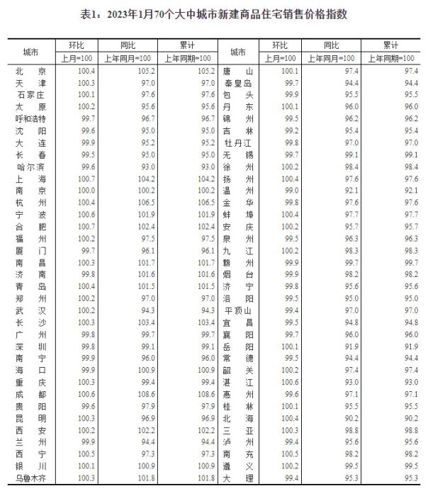 2023年1月份,70個大中城市中商品住宅銷售價格環(huán)比上漲城市個數(shù)增加;一線城市商品住宅銷售價格環(huán)比轉漲、二三線城市環(huán)比降勢趨緩,一線城市商品住宅銷售價格同比上漲、二三線城市同比下降。
