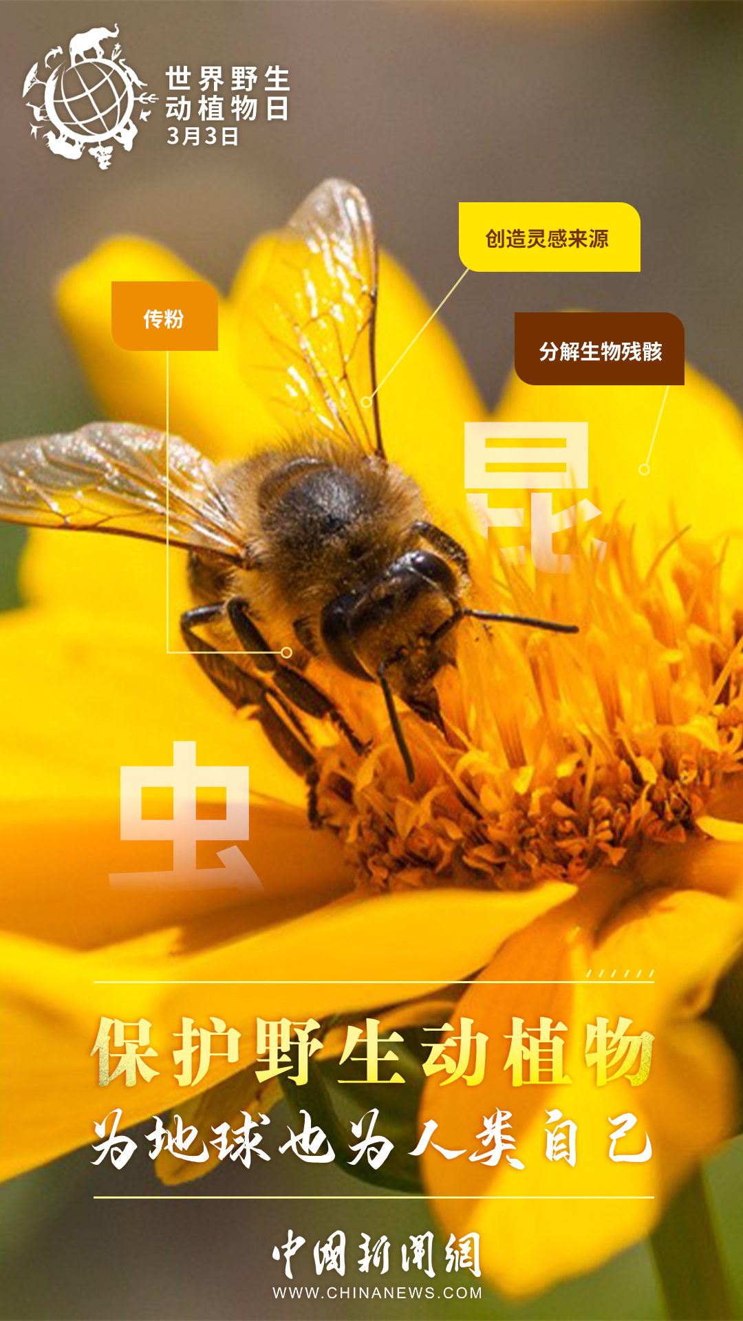 世界約80%的農(nóng)作物都依賴蜜蜂等蟲媒傳粉,一座鯨的尸體可以供養(yǎng)一套以分解者為主的循環(huán)系統(tǒng)長(zhǎng)達(dá)百年……其實(shí),大自然里的每種生物都有它存在的價(jià)值。今天是第十個(gè)“世界野生動(dòng)植物日”,戳圖了解它們的作用,一起來(lái)保護(hù)野生動(dòng)植物。