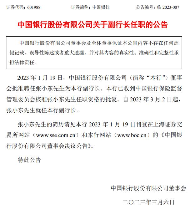 中國(guó)銀行6日發(fā)布的公告顯示,2023年1月19日,中國(guó)銀行董事會(huì)批準(zhǔn)聘任張小東為該行副行長(zhǎng)。該行已收到銀保監(jiān)會(huì)核準(zhǔn)張小東任職資格的批復(fù)。自2023年3月2日起,張小東就任中國(guó)銀行副行長(zhǎng)。