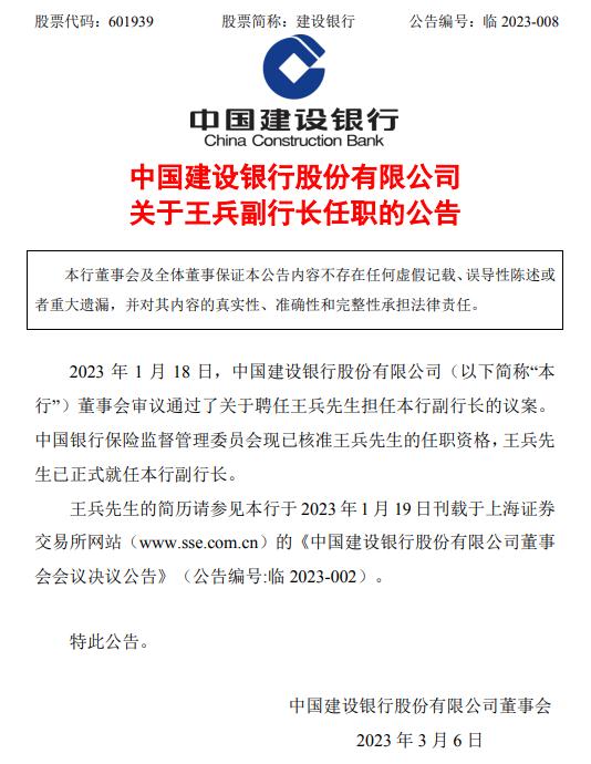 建設(shè)銀行6日發(fā)布的公告顯示,2023年1月18日,建設(shè)銀行董事會(huì)審議通過(guò)了關(guān)于聘任王兵擔(dān)任建設(shè)銀行副行長(zhǎng)的議案。中國(guó)銀保監(jiān)會(huì)現(xiàn)已核準(zhǔn)王兵的任職資格,王兵已正式就任建設(shè)銀行副行長(zhǎng)。