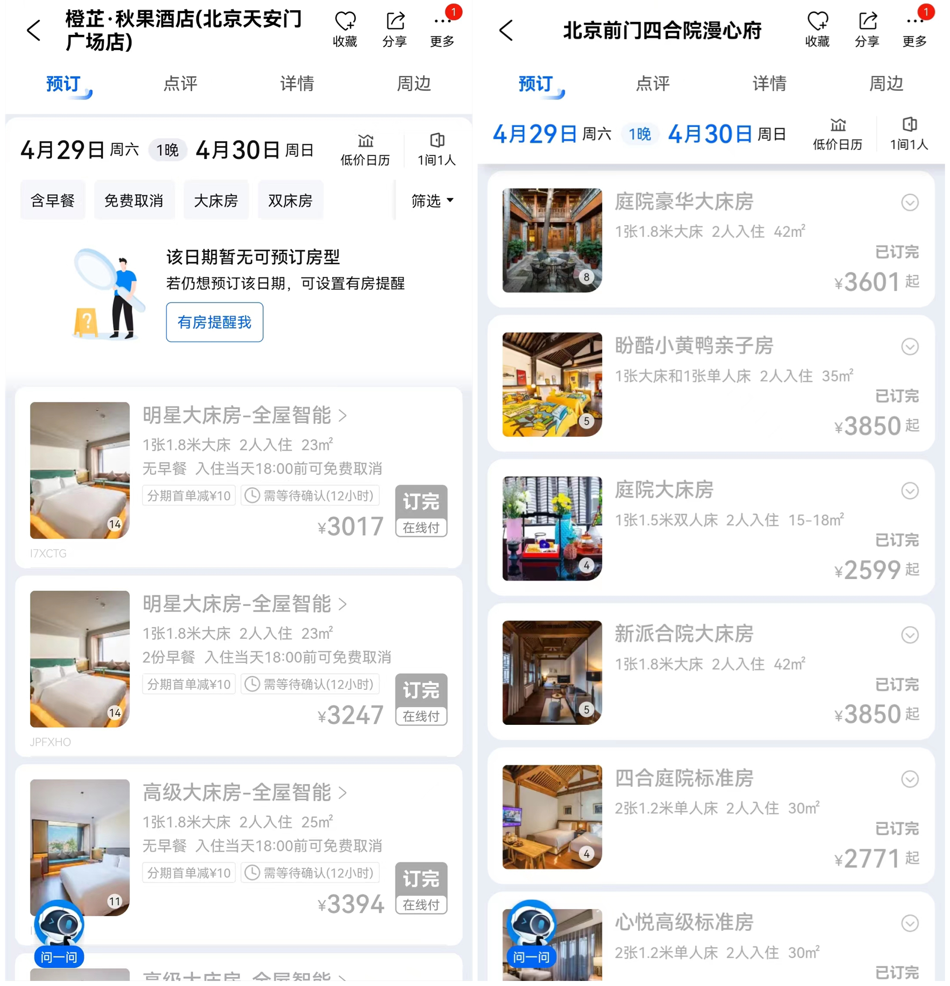 北京天安門附近有酒店已顯示滿房,或多個房型訂滿。截圖來源:攜程旅行App