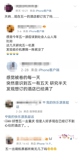 社交平臺上,多名網(wǎng)友早已規(guī)劃好了自己“五一”出行的計(jì)劃,并已提前購買機(jī)票和酒店,面對緊俏的旅游產(chǎn)品,有網(wǎng)友驚呼:“現(xiàn)在就已經(jīng)訂不到房了嗎?”“低價機(jī)票隔一會兒就沒了!”