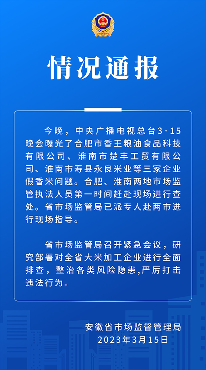 聲明還稱,安徽省市場監(jiān)管局召開緊急會議,研究部署對全省大米加工企業(yè)進行全面排查,整治各類風險隱患,嚴厲打擊違法行為。(中新財經)