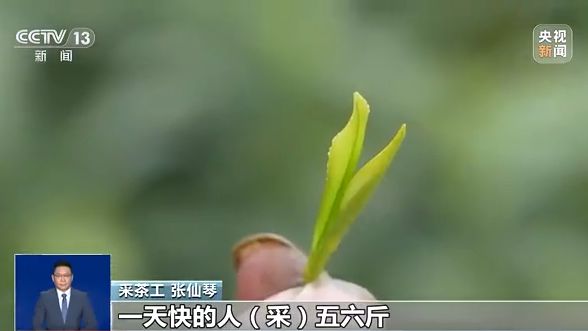 采茶工 張仙琴:我采茶差不多有二十七八年了,這個嫩芽(采摘)我們手工采的話,一天快的人(采)五六斤,慢的人(采)兩斤多。