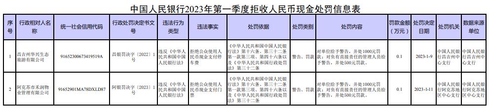 2023年第一季度,人民銀行依法對(duì)昌吉州華興生態(tài)旅游有限公司、阿克蘇市禾潤(rùn)物業(yè)管理有限公司等2家拒收人民幣現(xiàn)金的單位及相關(guān)責(zé)任人作出經(jīng)濟(jì)處罰。