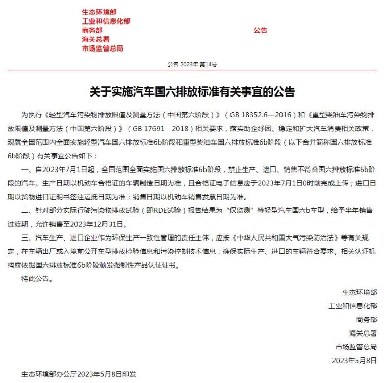 其中要求,自2023年7月1日起,全國范圍全面實施國六排放標(biāo)準(zhǔn)6b階段,禁止生產(chǎn)、進(jìn)口、銷售不符合國六排放標(biāo)準(zhǔn)6b階段的汽車。生產(chǎn)日期以機(jī)動車合格證的車輛制造日期為準(zhǔn),且合格證電子信息應(yīng)于2023年7月1日0時前完成上傳;進(jìn)口日期以貨物進(jìn)口證明書簽注運抵日期為準(zhǔn);銷售日期以機(jī)動車銷售發(fā)票日期為準(zhǔn)。