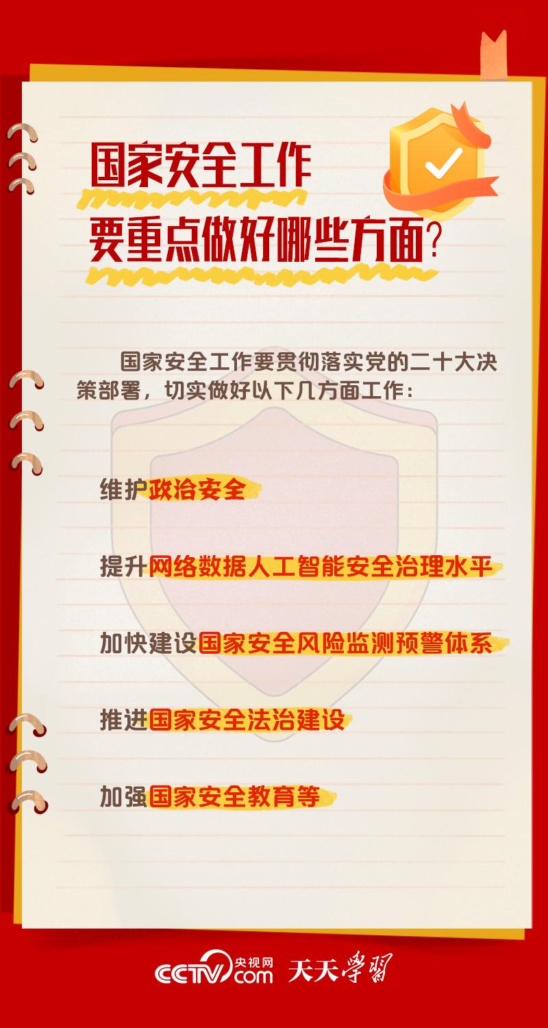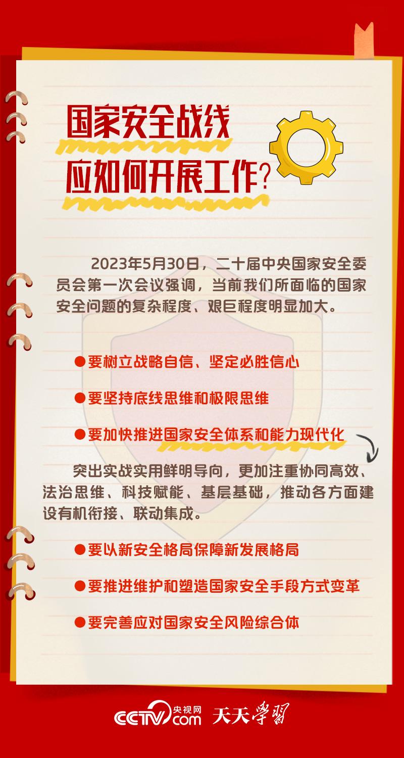 天天學(xué)習(xí) 5月30日,習(xí)近平總書記主持召開二十屆中央國(guó)家安全委員會(huì)第一次會(huì)議時(shí)強(qiáng)調(diào),要全面貫徹黨的二十大精神,深刻認(rèn)識(shí)國(guó)家安全面臨的復(fù)雜嚴(yán)峻形勢(shì),正確把握重大國(guó)家安全問題,加快推進(jìn)國(guó)家安全體系和能力現(xiàn)代化,以新安全格局保障新發(fā)展格局,努力開創(chuàng)國(guó)家安全工作新局面。