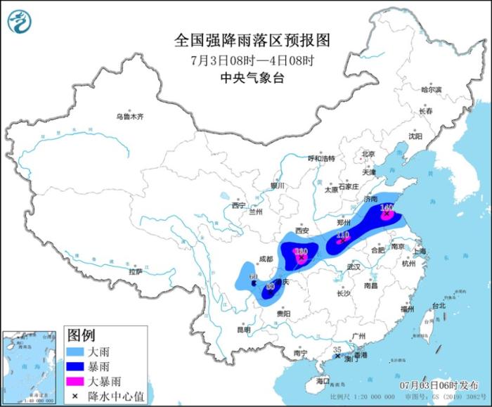 中央氣象臺7月3日06時繼續(xù)發(fā)布暴雨藍色預(yù)警:預(yù)計,7月3日08時至4日08時,山東中南部、江蘇北部、安徽北部、河南東部和南部、湖北北部和西部、陜西南部、重慶、四川東部、貴州西北部、云南東北部以及廣東西南部沿海等地部分地區(qū)有大到暴雨,其中,山東南部、江蘇北部、河南南部、重慶北部、四川東北部等地局地有大暴雨(100~160毫米)。上述部分地區(qū)伴有短時強降水(最大小時降雨量30~50毫米,局地可超過60毫米),局地有雷暴大風等強對流天氣。