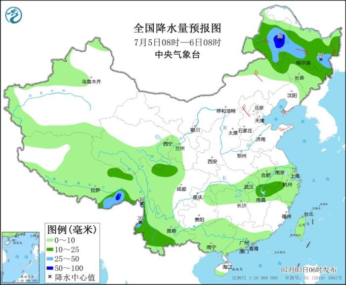 7月5日08時至6日08時,內(nèi)蒙古東北部、黑龍江、吉林北部以及江西北部、安徽南部、川西高原北部、云南西部和南部、西藏東南部等地部分地區(qū)有中到大雨,其中,內(nèi)蒙古東北部、西藏東南部等地部分地區(qū)有暴雨(50~65毫米)。內(nèi)蒙古中東部、華北北部和東部、山東半島、東北地區(qū)北部和南部等地部分地區(qū)有4~6級風。